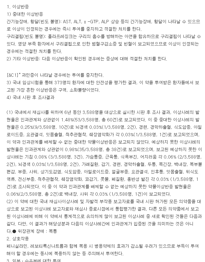 약물 복용 시에는 약품 설명서를 면밀히 읽어 보길 바라며, 조금이라도 이상반응이 느껴진다면 약품 복용을 즉시 멈추고 반드시 전문의와 진료와 상담을 통해 질병을 치료하길 바랍니다.